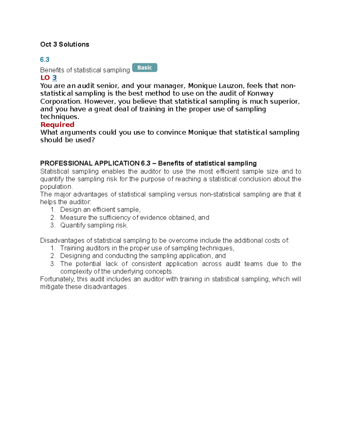 Ch 6 Solutions Lecture Notes 6 Oct 3 Solutions 6 Benefits Of Statistical Sampling Lo 3 You Are Studocu